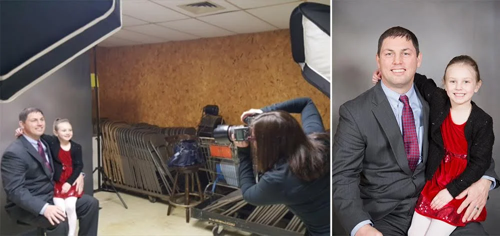 Dads and their daughters line up to get their portrait taken by Reflections Photography and are given a complimentary 5x7 each year. Because of how busy the dance is year after year, we have had to set up shop in the large closet in the KC Hall. Surrounded by the extra tables and chairs that are stored in this closet is where Reflections Photography creates a beautiful memento to send each of these families.